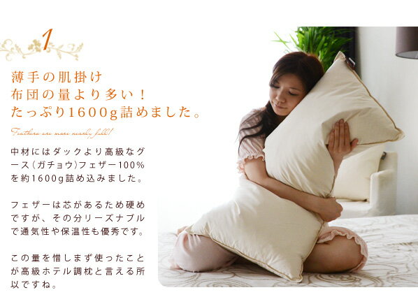 商品詳細 品名ホテル仕様 日本製 羽根枕 『リッチフェザーピロー』サイズ 約43×100cm ※中わたのボリュームで製品サイズは若干小さくなります。