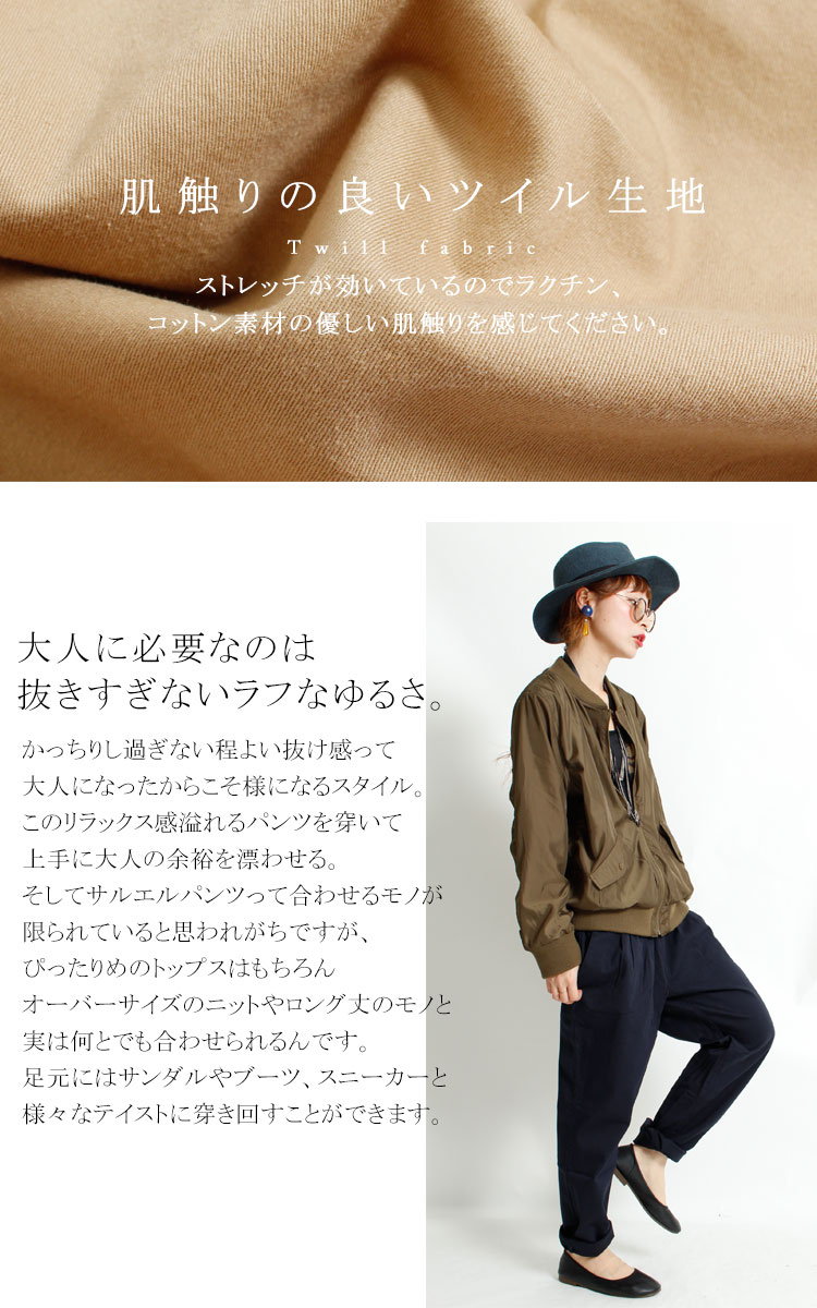 タック入りで、太もも、ヒップ回りにゆとりを持たせてありますが、裾に向かって細くなるテーパードタイプですので、メリハリも生まれます。